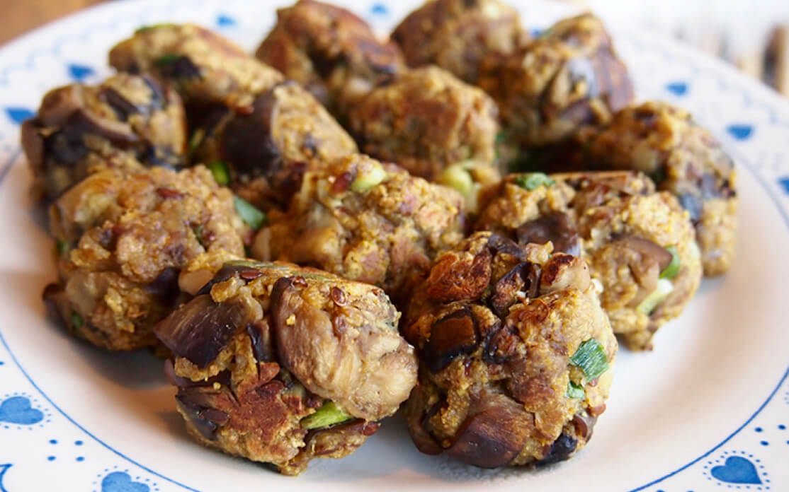 Rol van dit mengsel – het hangt qua structuur tussen gehakt en deeg in – balletjes ter grootte van een ongepelde walnoot. Rol die balletjes door het laatste beetje paneermeel.