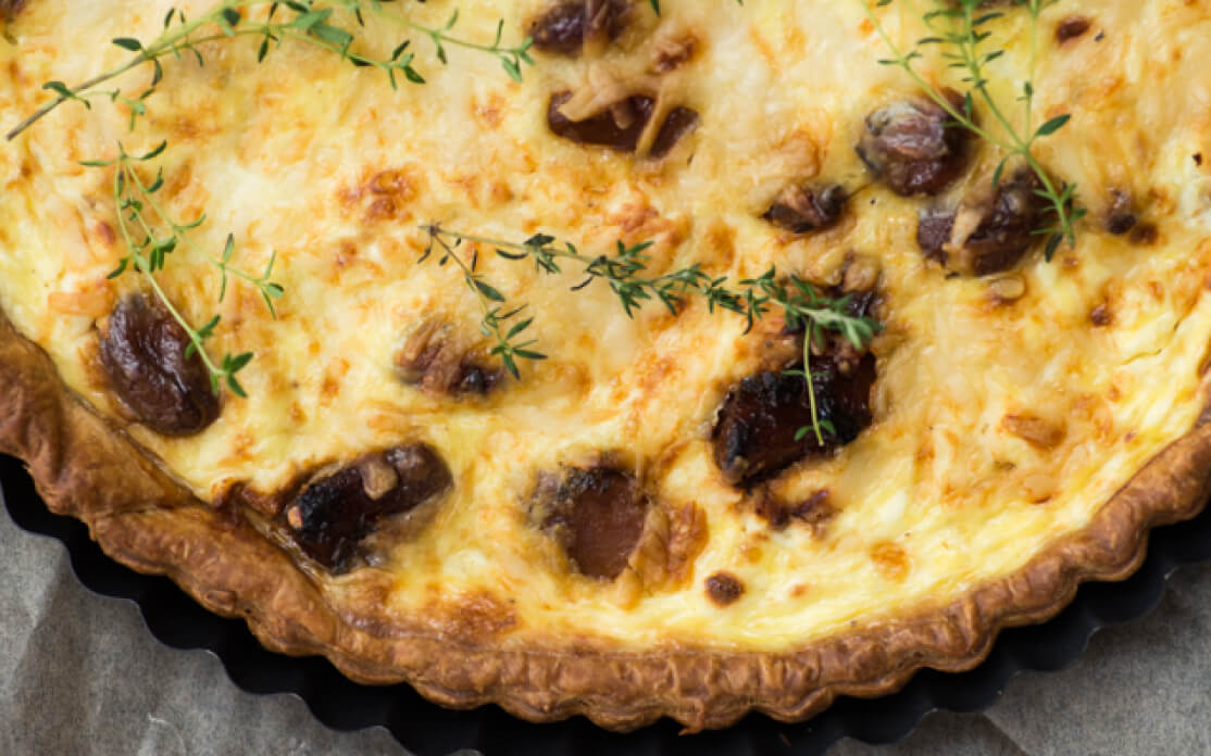 Schakel de over terug naar 160 ℃ en zet de taart erin. Bak hem 35-45 minuten tot de vulling stevig en de bovenkant goudbruin is. Neem de vorm uit de oven en laat de taart iets afkoelen. Haal hem uit de vorm, snijd de bladerdeegrand eventueel glad af, leg wat toefjes tijm op de taart en dien hem warm op (u kunt hem goed opwarmen!) met een knapperige salade.