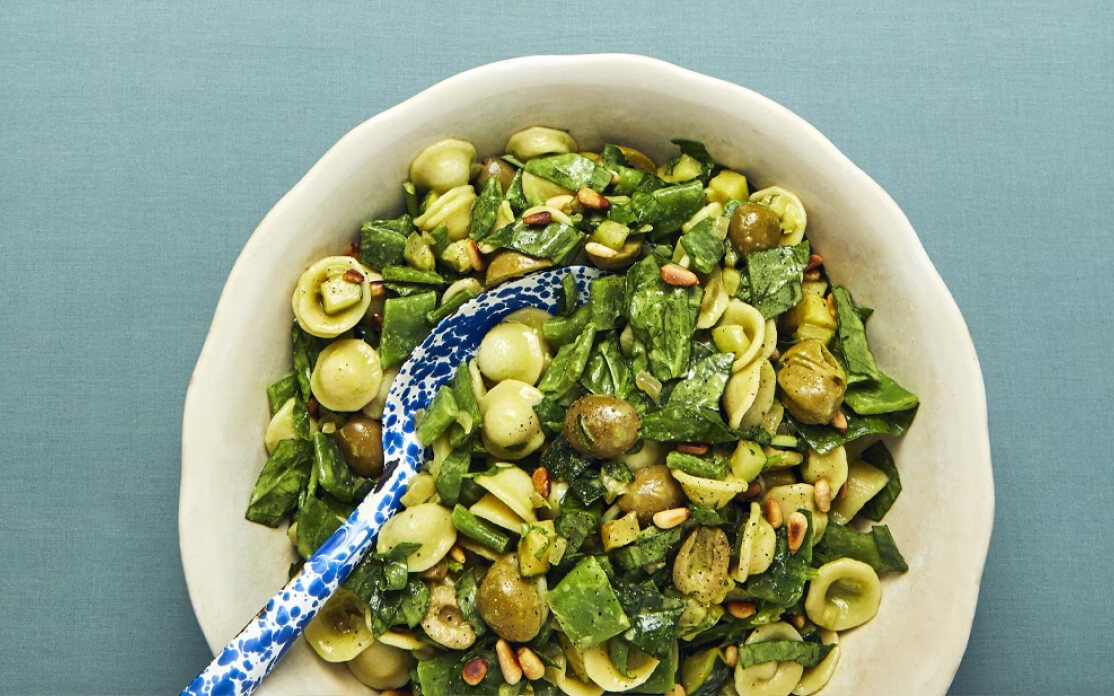 Schep alles voor de pasta (sperziebonen, ui, knoflook, courgette, geroosterde pijnboompitten en olijven) door elkaar in een grote schaal. Schep vlak voor het opdienen de dressing erdoor (je houdt wat dressing over).