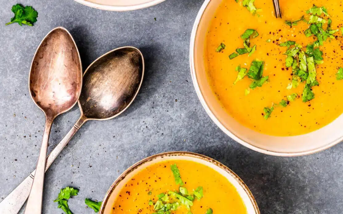 Voeg de ui, gember en 2/3e koriander toe aan de pan met pastinaak en wortel en pureer alles met een staafmixer glad. Garneer met de overige koriander.