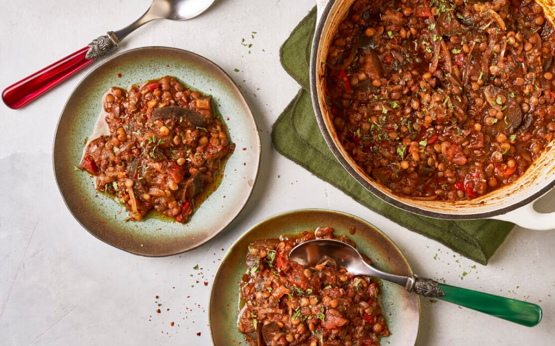 Verdeel een derde van het linzenmengsel over de bodem van een medium diepe pan. Verdeel de helft van de aubergine nu over het linzenmengsel. Herhaal dit nog een keer en eindig met een laag linzenmengsel. Giet het opgevangen kookvocht van de linzen erbij en laat het geheel 30 minuten op laag vuur sudderen met het deksel op de pan.
