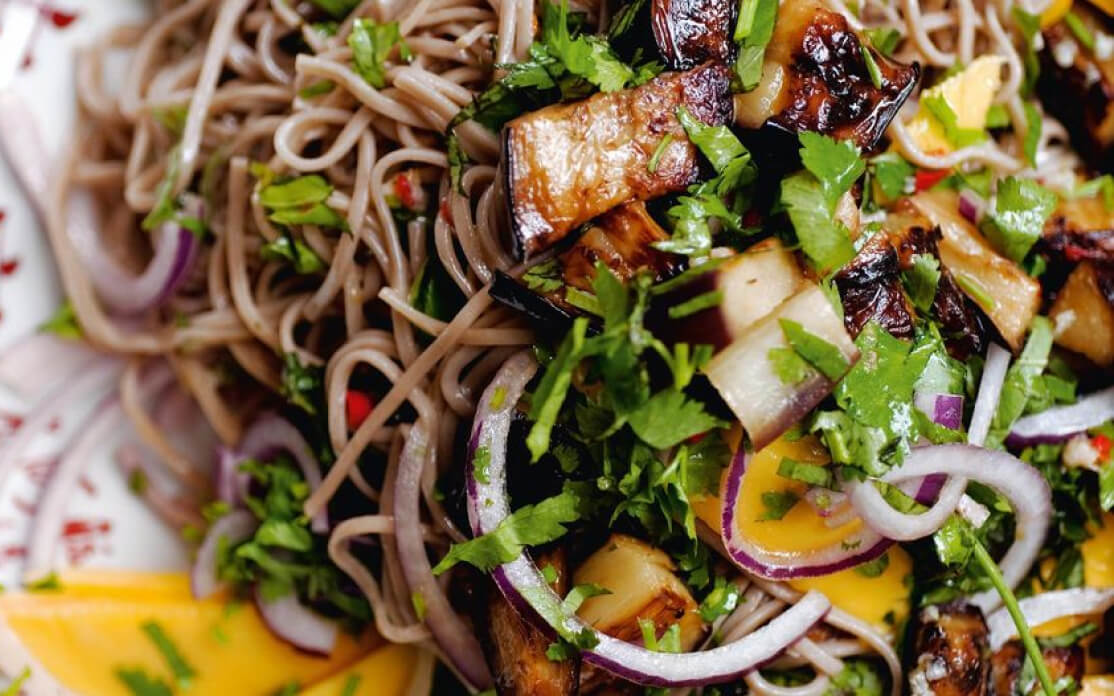 Vermeng de noedels in een mengkom met de dressing, mango gesneden in blokjes van 1 cm, aubergine, de helft van de kruiden en de ui. Zet de kom 1-2 uur opzij. Meng er vlak voor het opdienen de rest van de kruiden door.