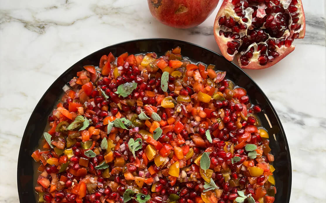 In a small bowl whisk the pressed garlic, allspice, vinegar, pomegranate molasses, olive oil, and 1/3rd teaspoon of salt, until well combined. Pour this over the tomatoes and gently mix.