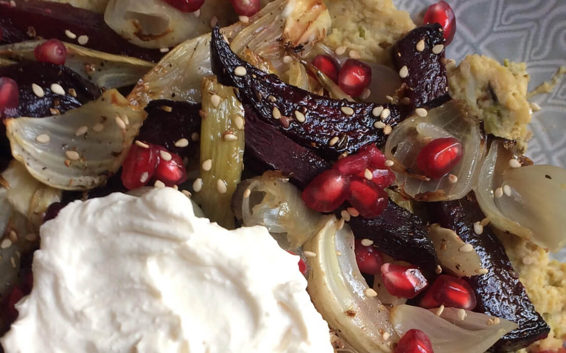 Spruitjes-dadelhummus met geroosterde biet en venkel